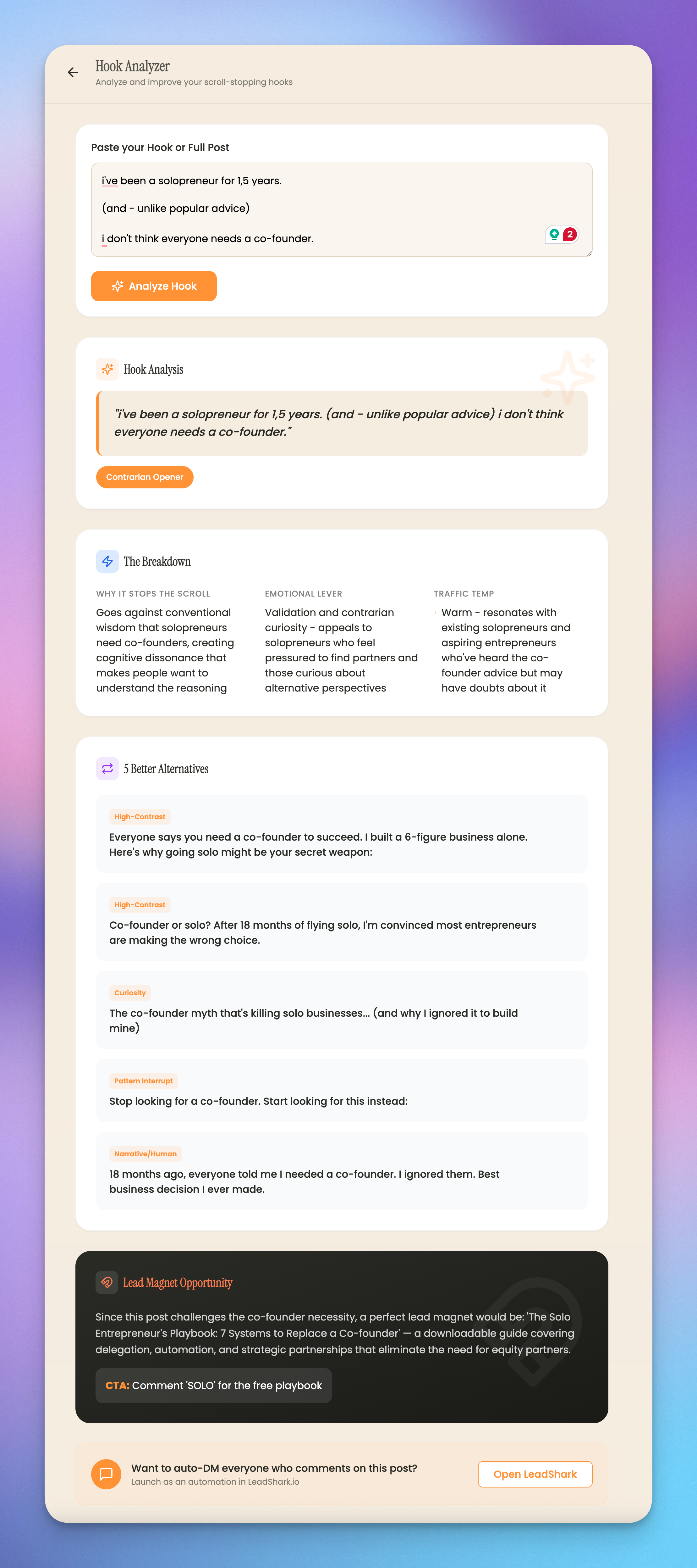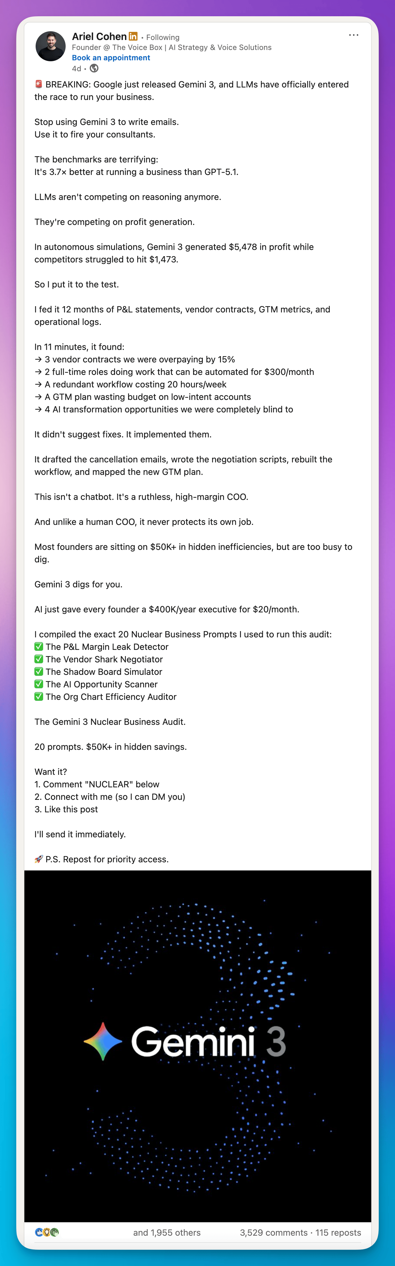 π Lead Magnet Club #15: "find your dream 100"hey club! ariel posted a lead magnet 2 days ago. and 3.5K people went "NUCLEAR" to get it. he did it not by luck. but by knowing exactly what hook makes founders stop scrolling. also this week, we analyze traffic secrets by russell brunson. and the one concept that changes everything: the dream 100! in this week's club edition we cover: β ariel's gemini 3 audit breakdown β why you need a dream 100 list (and how to build it) β π free tool: hook analyzer (analyzes any hook + gives 5 better alternatives) β how to find viral posts in minutes, not hours let's keep pushing! π¦Ύ π§² lead magnet of the weekthe gemini 3 nuclear business audit by @arielcohen 3,529 comments β’ 1,956 reactions β’ 115 reposts β’ keyword: "NUCLEAR" ariel posted: "π¨ BREAKING: Google just released Gemini 3, and LLMs have officially entered the race to run your business. Stop using Gemini 3 to write emails. Use it to fire your consultants. So I put it to the test. I fed it 12 months of P&L statements, vendor contracts, GTM metrics. In 11 minutes, it found: β 3 vendor contracts we were overpaying by 15% β 2 full-time roles doing work that can be automated for $300/month β A redundant workflow costing 20 hours/week This isn't a chatbot. It's a ruthless, high-margin COO." the offer: 20 nuclear business prompts to audit your business. find $50K+ in hidden savings. cta: comment "NUCLEAR" + connect + like. repost for priority access. why it worked: β relevant, hot-topic: gemini 3 launched nov 18. ariel posted 2 days later. perfect timing. β pattern interrupt: "stop using it to write emails. use it to fire your consultants." unexpected angle. β specificity of metrics: 3.7x better. $5,478 profit. 11 minutes. $50K savings. exact numbers = credibility. β clearly high stakes: $50K inefficiencies vs. $400K COO for $20/month. the gap hurts. and this further drives the pain-point. β LM mechanics: as expected. a key driver of virality is the post format (comment for the prompts, and repost for priority)! ariel knows his dream customers are founders, drowning in ops, in dire need of automation. and his hook promises exactly this: automation > delegation. hitting the ball out-of-the-park once again! βΎοΈ π¬ see the full post here β linkedin.com/posts/arielcohenβ π book of the weekTraffic Secrets by Russell Brunsoni re-read it last week and dissected the exact framework behind every viral lead magnet! russell brunson's core insight: "you don't create traffic. you find where it's already flowing and redirect it." here are 3 core ideas: 1. the dream 100 (explore)make a list of 100 people who already have your dream customers' attention. "Your Dream 100 are your ticket to unlimited traffic. These are the people and companies who have already congregated your dream customers." not random influencers. 100 specific people whose audience would love what you do. for lead magnet creators: founders posting viral content in your niche, creators with engaged audiences in your space, newsletter writers whose subscribers match your ICP. the strategy: study them. engage with them. collaborate when possible. ariel's 3,526 comments? he knows his dream 100. he's targeting founders drowning in ops. when he drops a lead magnet about efficiency, they share it. 2. hook, story, offer (create content)every viral post has three parts: hook: stops the scroll "The hook is what captures attentionβit's the first image or message that prompts a viewer to stop scrolling." for example ariel's post: hook (π¨ BREAKING: gemini 3) β story (i tested it, found $50K savings) β offer (comment NUCLEAR for the prompts). most people skip the story. they go hook β offer. but the story is where trust happens. 3. own your traffic (nurture)"Traffic that you own is the most valuable type of traffic in online marketing." comments = earning traffic. emails = owning traffic. if linkedin changes the algorithm tomorrow, your reach disappears. but emails? you own forever. ariel got 3,526 comments. if he's collecting emails from each one, that's 3.5K+ people he can reach directly, outside any platform, at any time (to nurture these leads). β¨ check out the workbook here for more β traffic secrets conceptsβ π οΈ tool of the week1οΈβ£ free β Hook Analyzer (new tool!)i just built a brand new AI tool exclusively for leadmagnet.club members! this tool reverse-engineers any viral hook. (or improve your own) what it does: paste any hook β get the breakdown (why it's good) β see 5 better alternatives β get lead magnet ideas β copy and adapt. i pasted ariel's gemini 3 hook. the analyzer told me: