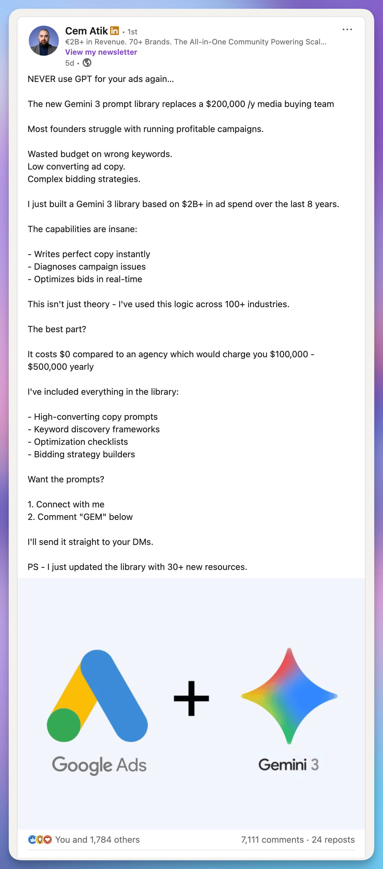 6,649 comments β’ 1,728 reactions β’ 22 reposts β’ keyword: "GEM"β the post: simple visual: google ads logo + gemini 3 logo with a plus sign between them. the offer: prompts for using gemini 3 with google ads. cta: