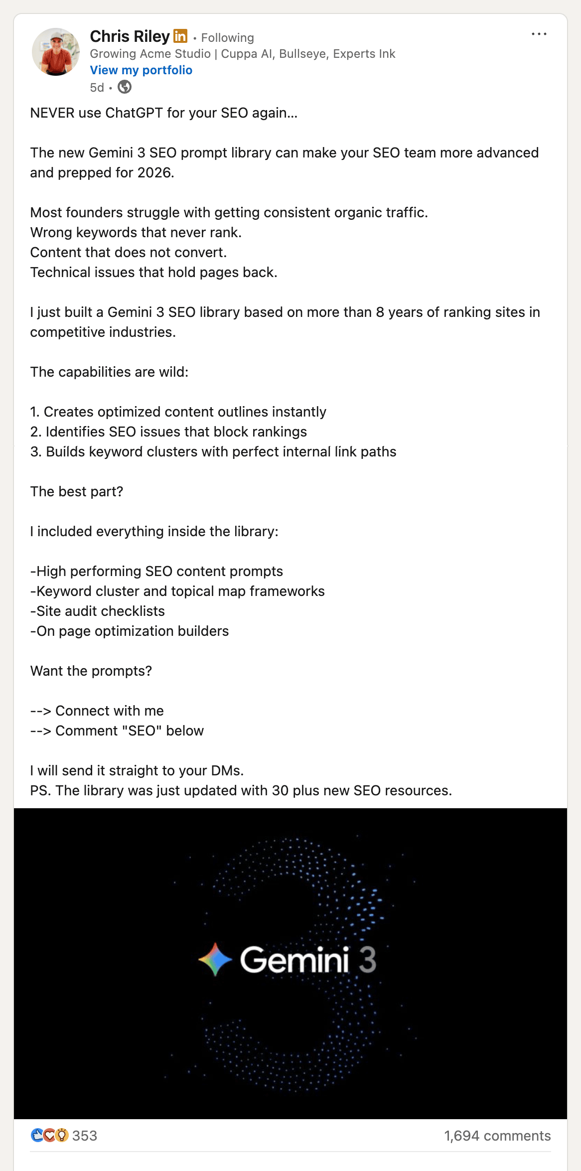 π Lead Magnet Club #18: "10x your leads, not your effort"hey club, 1,692 comments in 5 days. chris riley built a gemini 3 SEO library based on 8+ years of ranking sites in competitive industries.. what we cover: β chris's gemini 3 SEO library breakdown β what the book "10x Is Easier Than 2x" teaches about doing less β π free tool: AI image verifier for all images (check if an image is AI-generated) β how to turn comments into qualified leads with enrichment let's jump into it. π§² lead magnet of the weekthe gemini 3 SEO prompt library by @chrisriley 353 reactions β’ 1,692 comments β’ keyword: "SEO" the post: chris opened with a bold claim: "NEVER use ChatGPT for your SEO againβ¦" controversial? yes. scroll-stopping? absolutely. the offer: a gemini 3 SEO library with high-performing content prompts, keyword cluster frameworks, site audit checklists, and on-page optimization builders. why it worked: β pattern interrupt hook: "NEVER use ChatGPT" makes you stop and question everything. especially when everyone's using ChatGPT. β specific pain points: "wrong keywords that never rank. content that does not convert. technical issues that hold pages back." he named the exact frustrations. β credibility through experience: "8 years of ranking sites in competitive industries." not theory, lived experience. β capability showcase: instead of just listing features, he showed what the library CAN DO. "creates optimized content outlines instantly." action-oriented. β freshness signal: "the library was just updated with 30 plus new SEO resources." tells you this is maintained, not abandoned. β simple CTA: connect + comment "SEO". no friction. chris knows his audience: founders struggling with organic traffic. his hook challenges their current tool (ChatGPT) and offers something better. π¬ see the post β linkedin.com/posts/chris-riley-gtmβ π book of the week10x Is Easier Than 2x by Dan Sullivan & Benjamin Hardy chris got 1,692 comments from one post. but here's the real question: what does he do with all of them? dan sullivan (founder of Strategic Coach) wrote a book that answers this perfectly. his core idea: going for 10x growth is actually easier than 2x growth. sounds backwards, right? but here's why it works. the 2x trap when you aim for 2x, you try to do more of everything. more posts, more outreach, more hustle. you work harder but spread yourself thin. sullivan calls this "the 80% that doesn't matter." most entrepreneurs spend 80% of their time on activities that produce minimal results. they're busy, but not effective. the 10x filter when you aim for 10x, you're forced to think differently. you can't 10x by doing more of the same. you have to ask: "what's the 20% that actually drives results?" for lead magnets, this means: β not posting 10x more content β but creating 1 piece that gets 10x the engagement chris didn't post 10 mediocre lead magnets. he posted 1 that got 1,692 comments. quality over quantity sullivan's framework is about the four freedoms: time, money, relationships, and purpose. 10x entrepreneurs protect their time by focusing only on high-impact work. they build systems (like automation) to handle the rest. sound familiar? β 1 great lead magnet > 10 average ones β automated delivery > manual DMs β filtered leads > raw comment lists the 10x question for creators before your next post, ask yourself: "what would make this 10x more valuable than my last one?" not 10x more work. 10x more impact. that's how you go from chasing engagement to being oversubscribed. π οΈ tool of the week1οΈβ£ bonus β AI Image Verifier (new!)is that image real or AI-generated? last week we launched the headshot detector for linkedin profiles. this week: the general version for any image. what it does: upload any image β get instant analysis β know if it's AI-generated or real. use cases: β verify screenshots and testimonials β check product images before buying it β spot AI-generated content in your LinkedIn feed works with any image, not just headshots / human pictures. π try it: leads.sh/l/9y9zy1u7xwwd (it's free to use!) 2οΈβ£ for leadshark users β Enrich (find emails + filter by ICP)you got 1,000 comments on your lead magnet. now what? not all leads are equal. some are your ideal customers. some are just lurkers. the Enrich feature can help you find the ones that matter, and nurture them. what it does: β find emails and company info for your leads β filter by ICP score (only enrich leads above your threshold) β enrich up to 500 leads per day β upload CSVs or select leads manually how to use it: