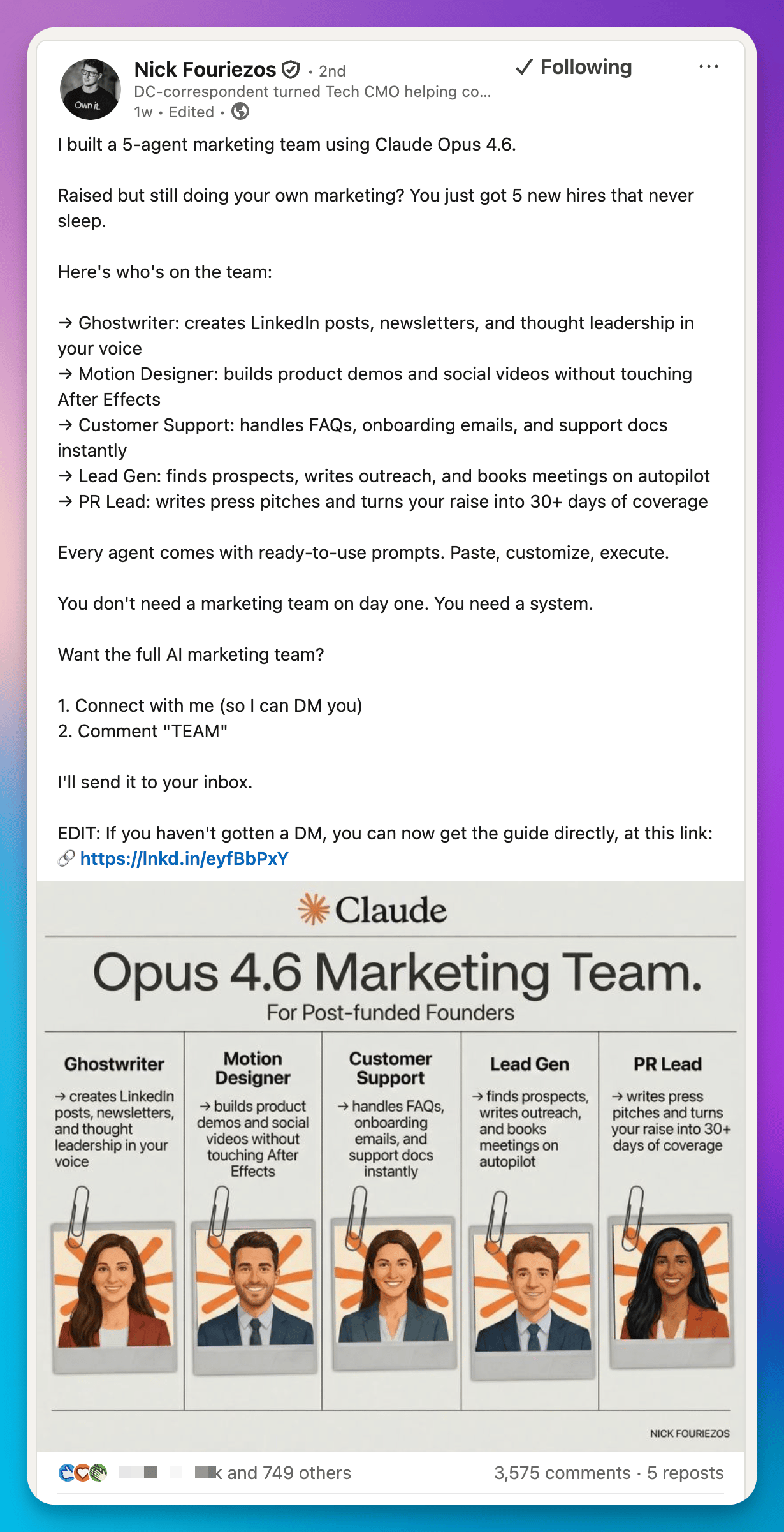hey club! π we are back on sunday. βοΈ this week: breaking down nick's AI marketing team post, why it worked so well, and how you can copy the framework. also: finn v1.0 just shipped inside leadshark. π§² lead magnet of the weeknick fouriezos "built a 5-agent marketing team using Claude Opus 4.6." post hook: "Raised but still doing your own marketing? You just got 5 new hires that never sleep." the numbers: β 750+ reactions β 3,575 comments β 5 reposts what he promised: a complete AI marketing team: 5 agents (ghostwriter, motion designer, customer support, lead gen, PR lead), each with ready-to-use prompts you can paste and customize. the format: β bold hook with a specific, tangible outcome β arrow bullet breakdown of each agent and what it does β simple CTA: connect + comment "TEAM" why it worked: