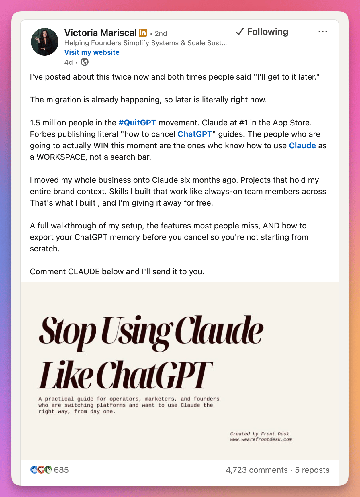 hey club! π the best lead magnets don't create demand. they ride it. victoria mariscal didn't invent anything new. she packaged a Claude walkthrough at the exact moment 1.5 million people were quitting ChatGPT. Forbes was publishing "how to cancel ChatGPT" guides. Claude hit #1 on the App Store. she posted at the right time, with the right offer, and 4,723 people commented. this week: why timing beats perfection, how to capture leads from posts you never even automated, and the two books every lead magnet creator should read. already on leadshark? go import leads from your old posts today β Leads β Post Engagements β Add Leads from Posts. not on leadshark yet? start your free trial ββ let's get into it. π§² lead magnet of the weekvictoria mariscal β "Stop Using Claude Like ChatGPT" the hook: "I've posted about this twice now and both times people said 'I'll get to it later.' The migration is already happening, so later is literally right now." this is a masterclass in urgency. she's not hyping the resource, she's telling you the window is closing. and she backs it up with proof: #QuitGPT trending, Claude at #1, Forbes writing cancellation guides. the numbers: β 685 reactions β 4,723 comments β 5 reposts what she promised: a full walkthrough of her Claude workspace setup, the features most people miss, and how to export your ChatGPT memory so you're not starting from scratch. the format: β repost framing ("I've posted this twice, people said later") β cultural moment as urgency (#QuitGPT, App Store ranking, Forbes) β specific, tangible deliverable (workspace walkthrough + memory export) β one-word CTA: comment "CLAUDE" β editorial-style visual (not a generic canva template) 3 reasons it worked: 1. she rode a wave, not created one. the #QuitGPT movement was already happening. 1.5 million people were already talking about switching. victoria didn't need to convince anyone that Claude was worth trying. she just needed to show them HOW. that's a completely different (and much easier) job. lesson: before you build your next lead magnet, ask: what's the wave right now? what are people already talking about, searching for, or switching to? your lead magnet should be the bridge between where they are and where they want to go. 2. the repost frame created social proof. "I've posted this twice and people said I'll get to it later" does two things at once. it proves people already wanted it (demand exists), and it creates FOMO (you're running out of chances). this is a technique you can steal for any lead magnet that performed well the first time. repost it, acknowledge the first round, and frame it as a last chance. lesson: don't be afraid to repost your best lead magnets. most people didn't see it the first time. and the ones who did but didn't act? they need a push. 3. the offer was genuinely useful, not just clever. a lot of lead magnets promise "frameworks" or "templates" that are really just repackaged common sense. victoria offered something people actually needed right now: how to set up Claude properly, features they'd miss without a guide, and a way to bring their ChatGPT data with them. every piece solved a real problem in the migration. lesson: the best lead magnets solve a problem people have TODAY. not someday. today. alex hormozi calls this making an offer so good people feel stupid saying no. victoria did exactly that. what you can steal: β ride a cultural moment instead of creating demand from scratch β the repost-with-urgency frame for high-performing posts β one-word CTA (frictionless, no explanation needed) β editorial visual design (stands out from canva templates) β bundle multiple value pieces into one resource (walkthrough + export guide + feature list) the leadshark angle: 4,723 comments is 4,723 leads. victoria has to DM each one manually (or add a link later and hope people click). with leadshark, the automation handles delivery from the first comment. every person who types "CLAUDE" gets the resource instantly. but here's what most people don't realize: you don't need to have had leadshark running when the post went live. you can go back and import every like and comment from ANY of your posts, even old ones. more on that below. β link to victoria's postβ π¦ leadshark feature: import leads from any postthis might be the most underused feature in leadshark right now. go to Leads β Post Engagements β Add Leads from Posts. you can import every person who liked or commented on your posts, even ones you published before you had leadshark. even ones you never set up an automation for. why this matters: think about every linkedin post you've ever published that got decent engagement. those likes and comments? those are people who raised their hand and said "this is relevant to me." and most of them just... disappeared. now you can bring them back. what you can do with imported leads: β enrich their email addresses β push them to your CRM or outreach tools via API/webhooks β start outreach campaigns based on people who already engaged with your content β build audiences from your best-performing posts, retroactively how to think about it: imagine victoria imported all 4,723 commenters into leadshark. she could enrich emails, segment by ICP, and push them into an email sequence or outreach tool. that's not cold outreach. those are warm leads who literally asked for her resource. you probably have posts sitting in your history right now with hundreds of likes and comments that never turned into anything. this feature lets you go back and capture that value. already on leadshark? go try it right now β Leads β Post Engagements β Add Leads from Posts. not yet? start your free trial and import leads from your first post in minutes. π what i'm reading$100M Offers + $100M Leads by alex hormozi i'm putting both of these together because they solve the two problems i see people struggling with the most: